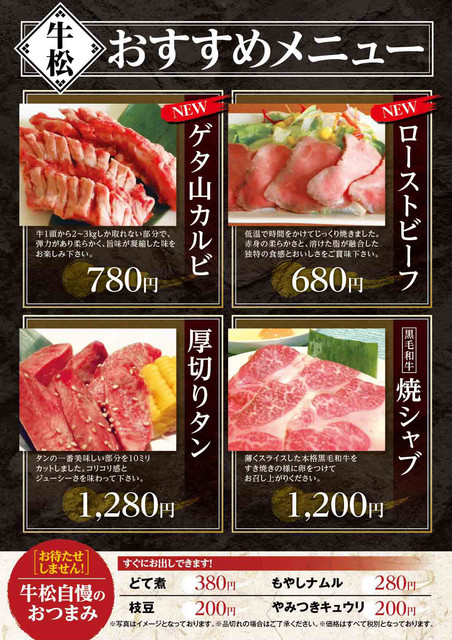 厚切り牛タン 980 3名様以上でゲタ山カルビが 1380 やきにく本舗 たみ家